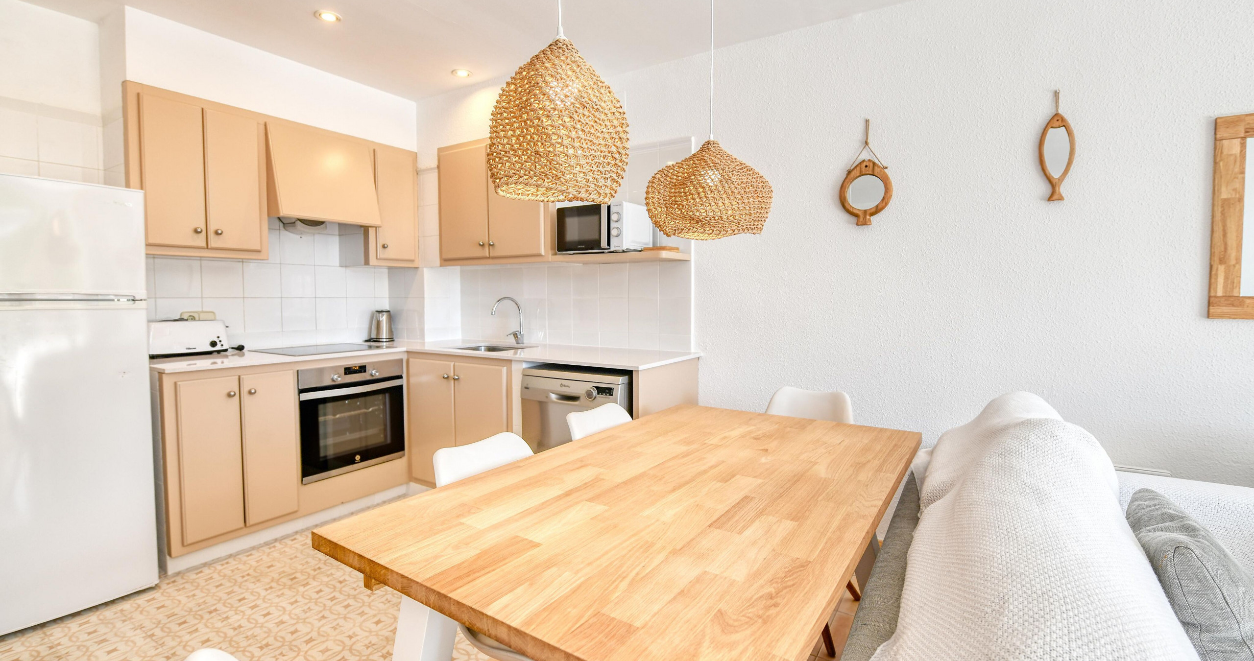 Die amerikanische Küche mit Glaskochfeld ist vollständig ausgestattet mit Kühlschrank, Gefrierschrank, Ofen, Mikrowelle, Geschirrspüler, Kaffeemaschine, Toaster, Wasserkocher und allem notwendigen Zubehör.