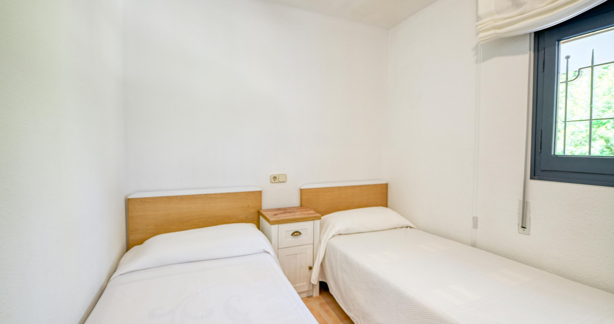 Im Inneren finden Sie 3 Schlafzimmer mit 6 Einzelbetten und 2 komplette Badezimmer (eines mit Dusche und eines mit Badewanne), die Komfort und Funktionalität für alle Gäste bieten.