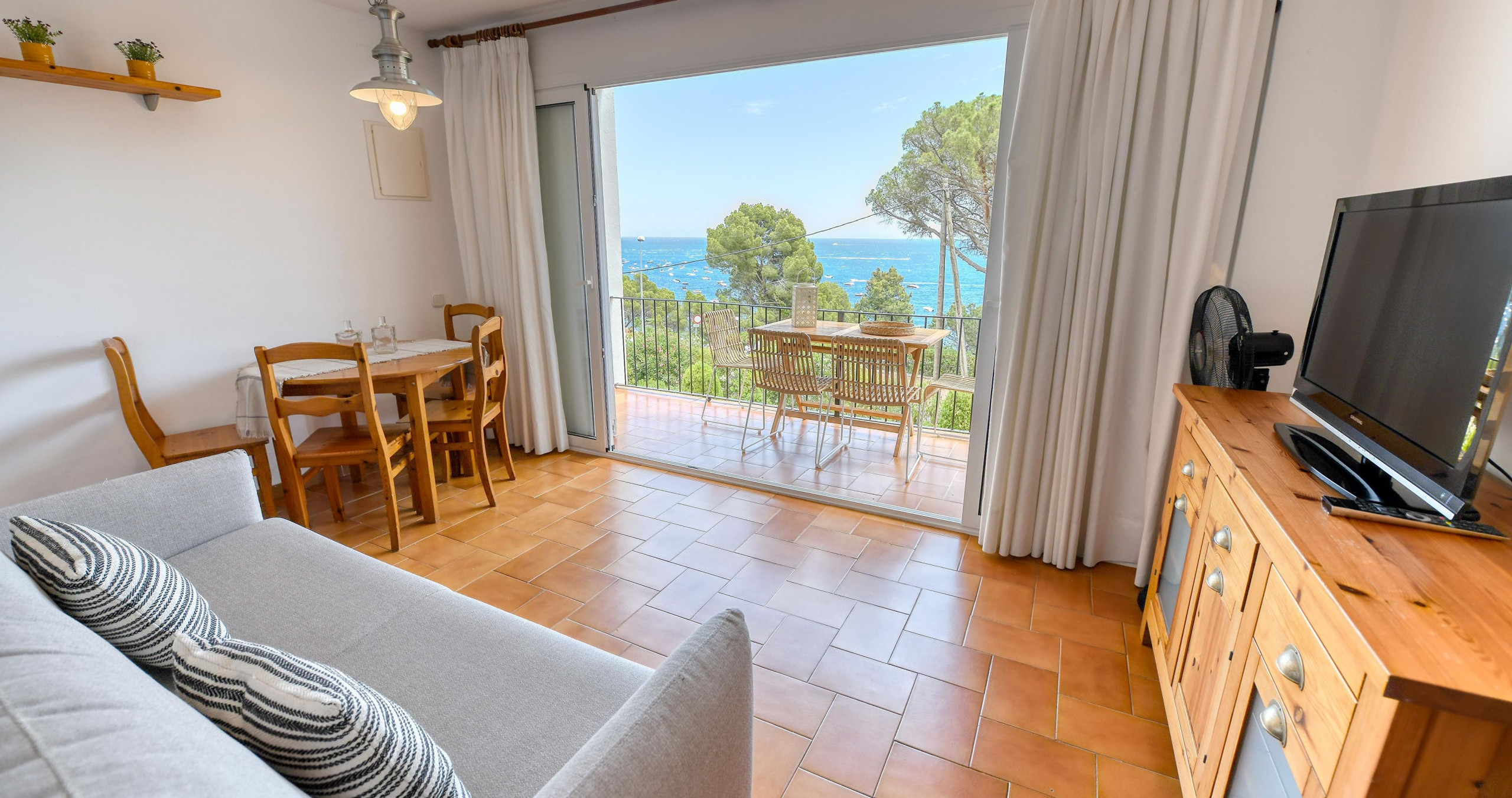 Apartment mit Meerblick in Calella de Palafrugell, ideal für Paare oder kleine Familien, die einen komfortablen Aufenthalt in einer der ruhigsten Gegenden der Costa Brava suchen. Diese 35 m² große Unterkunft bietet Platz für bis zu 4 Personen und liegt praktisch in erster Meereslinie. Das Apartment befindet sich in der Gegend von Sant Roc und zeichnet sich durch seinen angenehmen Blick auf das Mittelmeer und seine natürliche Umgebung aus. Von hier aus haben Sie direkten Zugang zum Camino de Ronda, perfekt zum Spaziergang am Meer bis zum Golfet und zum Genießen der Landschaft. Nur 50 Meter vom Strand entfernt, sowohl Sand- als auch Felsstrand, können Sie leicht zu Fuß gehen und das Meer jederzeit am Tag genießen. Darüber hinaus befindet sich das Stadtzentrum etwa 250 Meter entfernt mit allen Dienstleistungen und Restaurants in der Nähe. Das Apartment verfügt über eine Terrasse mit Meerblick, ein praktischer Platz zum Entspannen oder zum Essen im Freien. Im Inneren finden Sie ein Wohnzimmer mit Schlafsofa mit Doppelbett und ein Schlafzimmer mit 2 Einzelbetten sowie 1 komplettes Badezimmer mit Badewanne, das eine funktionale Aufteilung für kurze oder mittlere Aufenthalte bietet. Die separate Küche ist mit Kochfeld, Kühlschrank, Gefrierschrank, Ofen, Mikrowelle, Kaffeemaschine, Toaster, Wasserkocher und allem notwendigen Zubehör ausgestattet. Es gibt auch eine Waschmaschine und ein Bügeleisen. Zusätzliche Ausstattung: WLAN-Verbindung und Fernseher. Das Apartment verfügt über einen Parkplatz in der Gemeinschaft. Obwohl die Plätze nicht garantiert sind, haben Sie Vorrang durch einen Aufkleber, der Ihnen während Ihres Aufenthalts zur Verfügung gestellt wird. Lage: Supermarkt 260 m entfernt, Busbahnhof 6 km entfernt, Golfplatz 14 km entfernt und Flughafen 50 km entfernt. Eine praktische Option, um das Meer und die Ruhe von Calella de Palafrugell zu genießen.