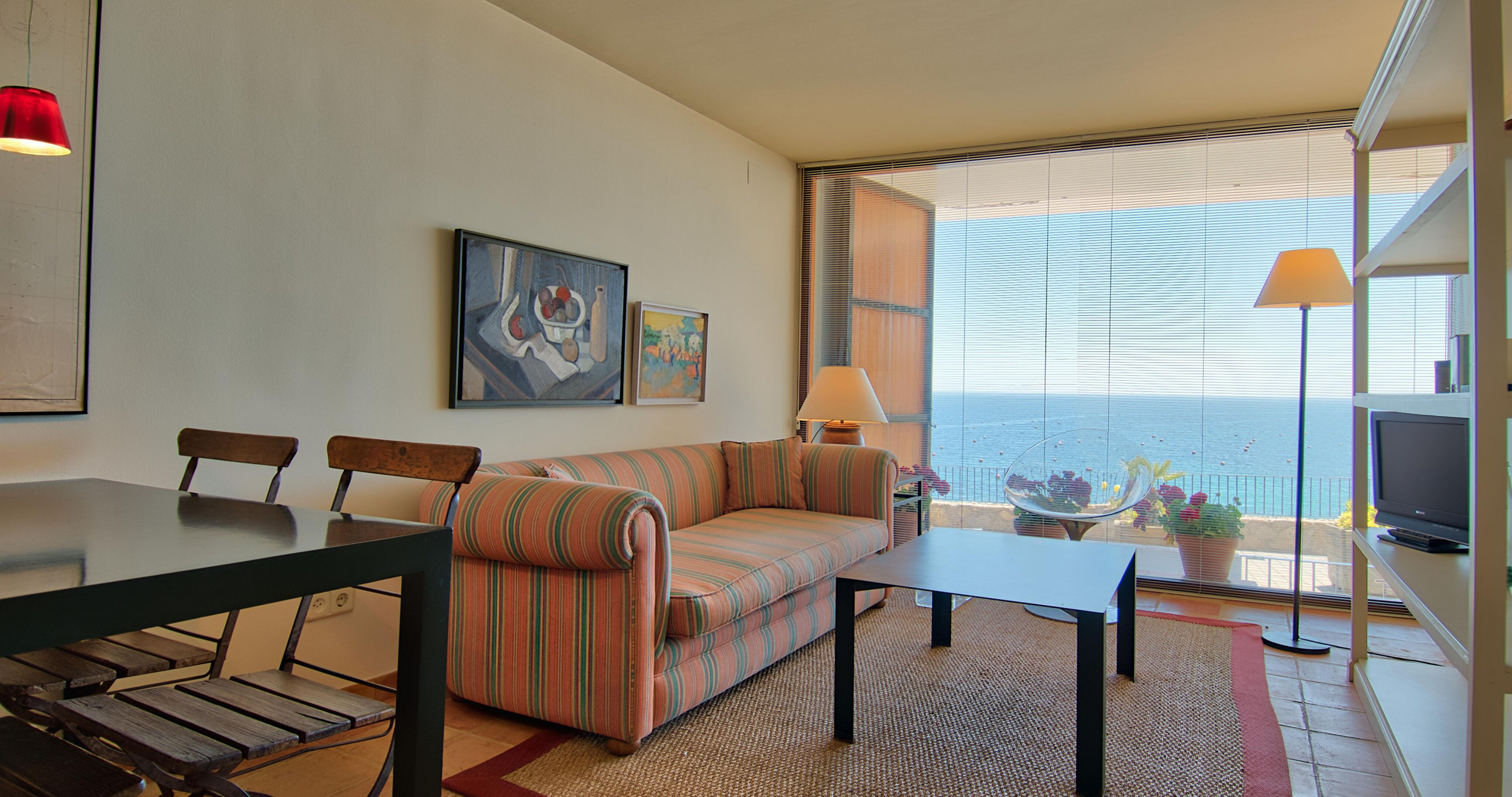 El apartamento dispone de un dormitorio con cama doble y una zona de estar luminosa con aire acondicionado. La cocina americana está totalmente equipada con nevera, lavadora, lavavajillas, horno, cafetera y menaje completo.