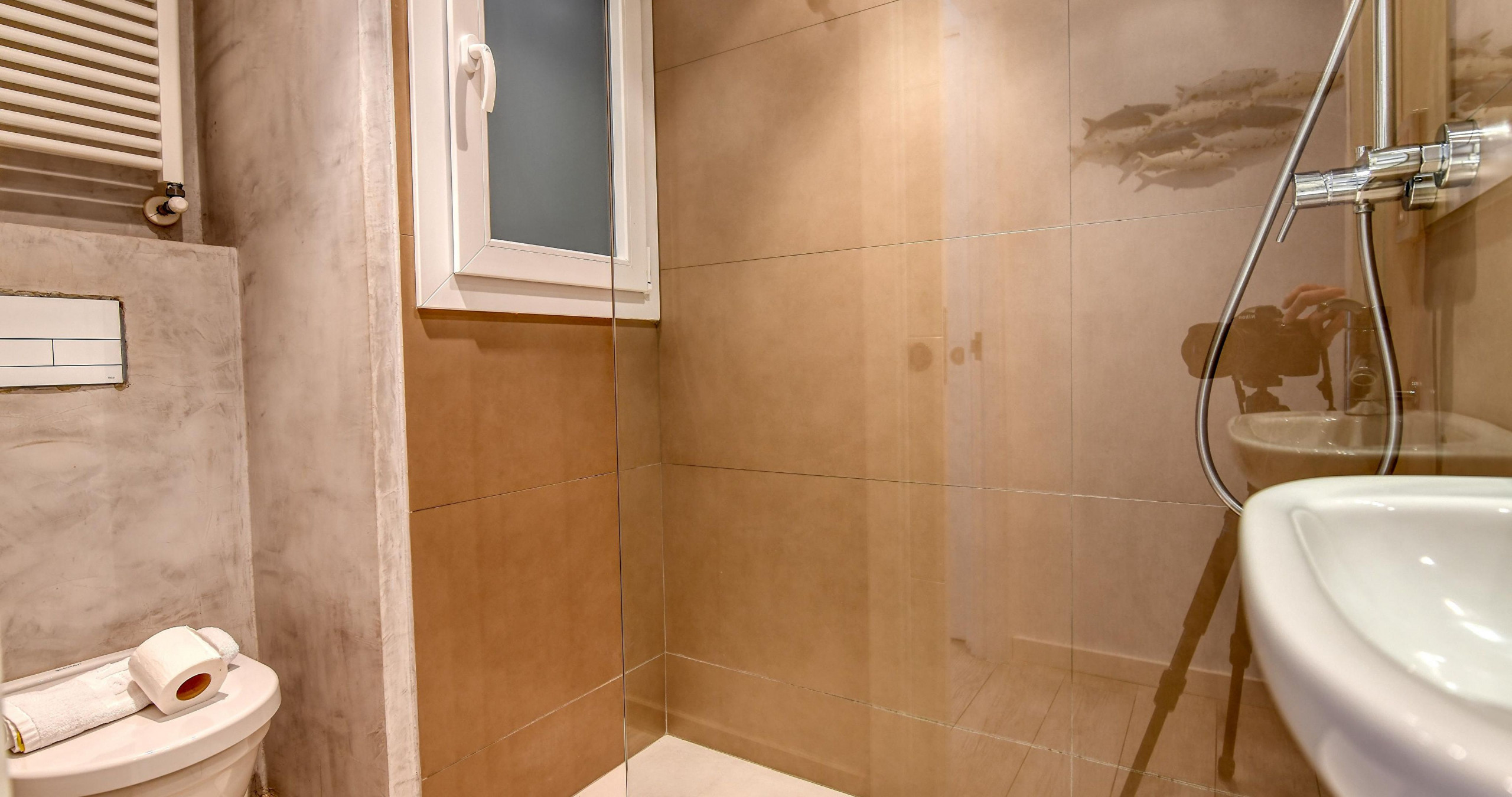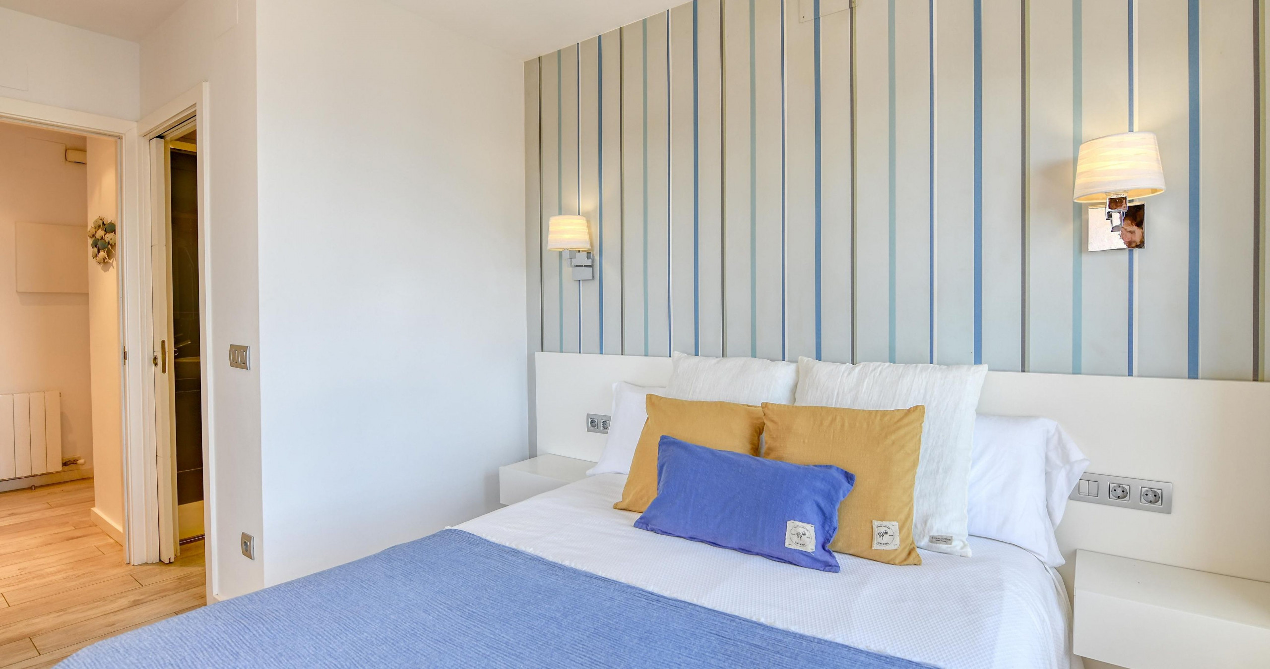 El apartamento cuenta con dos dormitorios cómodos y versátiles, con una distribución de camas que incluye una cama doble y dos individuales, ideal para familias o grupos pequeños. La luminosidad y el diseño interior crean un ambiente acogedor y funcional.