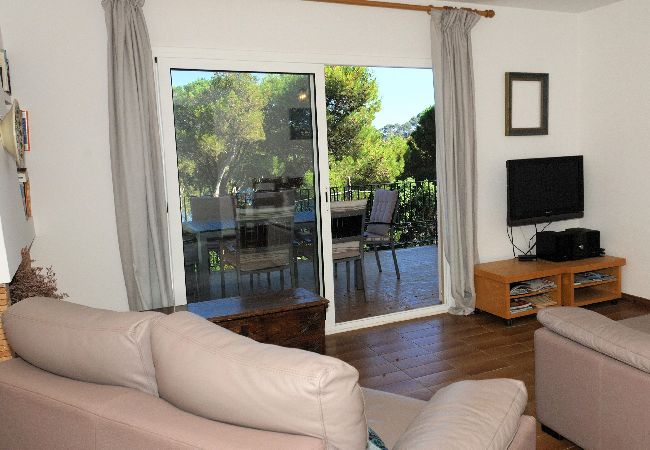 El apartamento en Calella de Palafrugell posee capacidad para 7 personas. Se encuentra a 12 m del campo de Golf "12m", 55 m del aeropuerto "55m", 400 m de la playa de arena "400m", 400 m de la playa de roca "400m", 2 km del supermercado "1500m". Dispone de lavadora, chimenea, plancha, pista de tenis, piscina comunitaria, parking aire libre en edificio cercano, 1 Televisor. La cocina independiente, eléctrica, está equipada con nevera, horno, vajilla/cubertería, utensilios/cocina y cafetera.