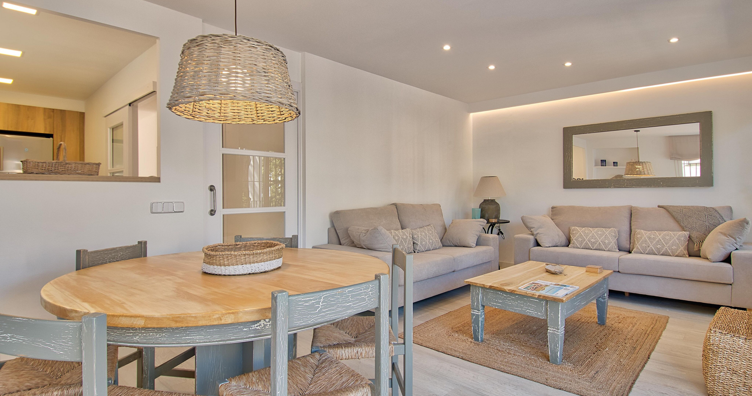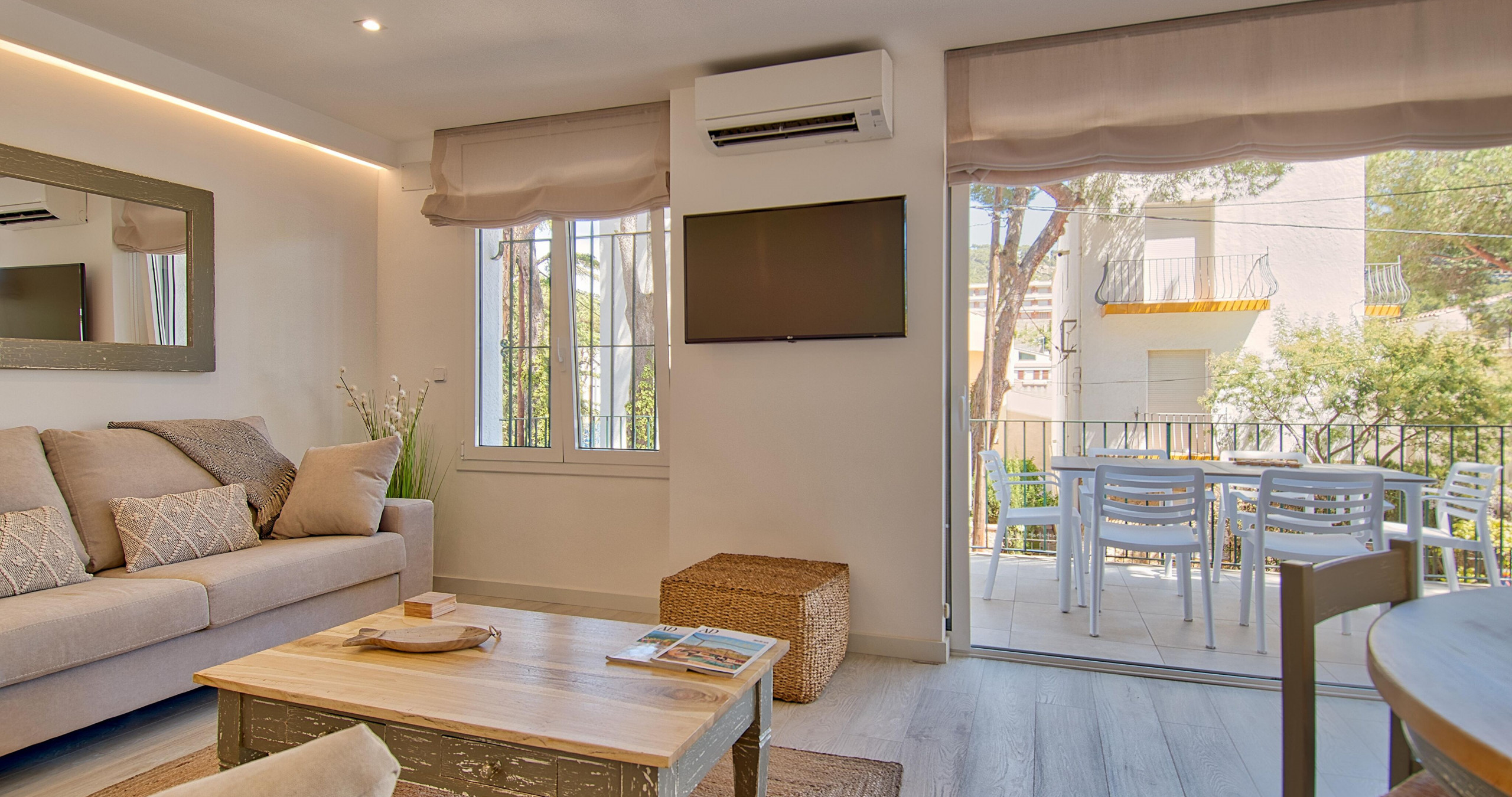 El apartamento cuenta con un diseño interior cuidadosamente pensado, destacando su terraza que invita a disfrutar de momentos tranquilos. La zona de estar cuenta con aire acondicionado para mantener un ambiente fresco durante los días más calurosos. La cocina está completamente equipada con electrodomésticos modernos como lavadora, lavavajillas, horno, microondas y cafetera, facilitando la preparación de comidas durante su estancia.