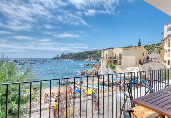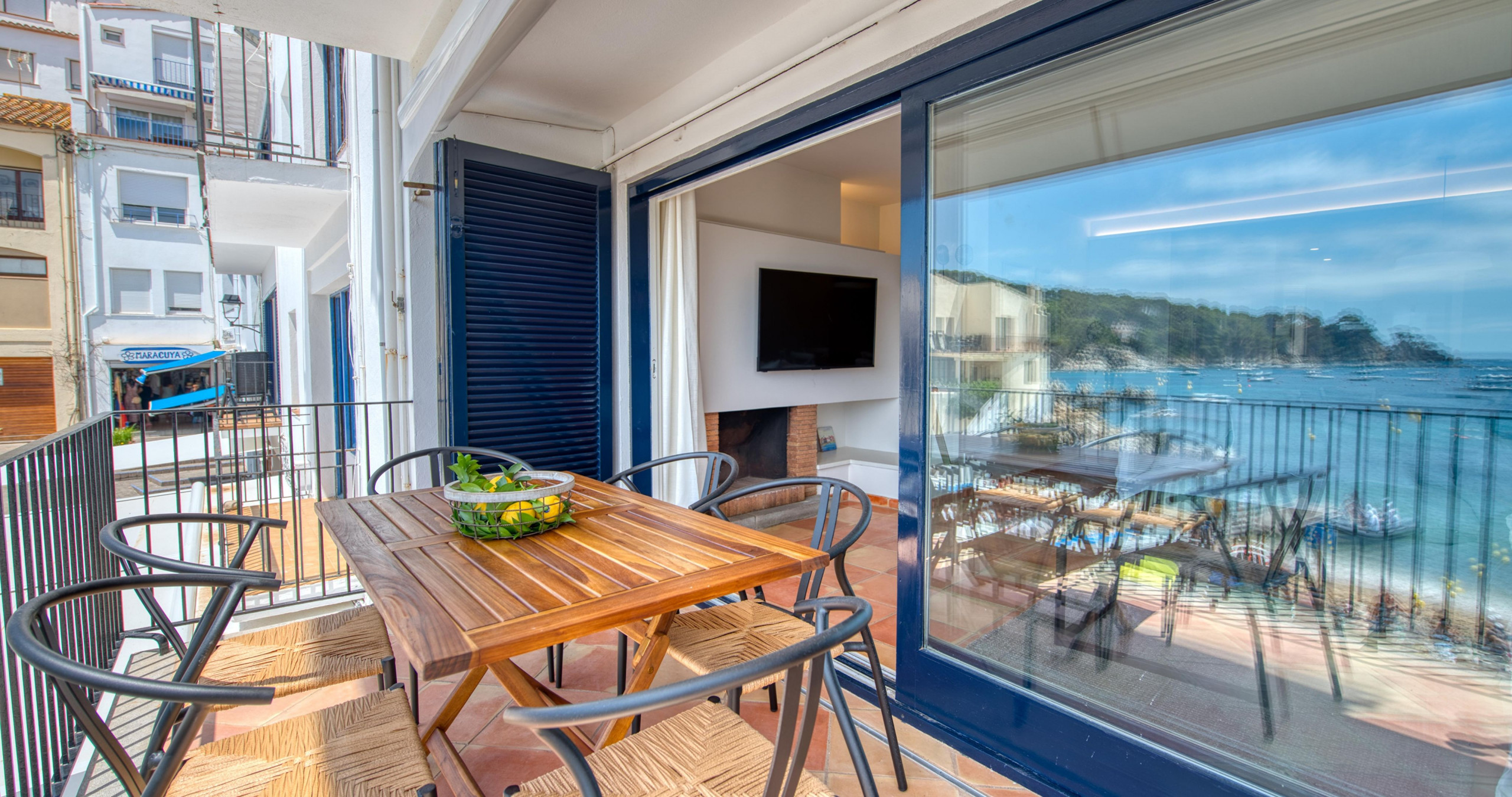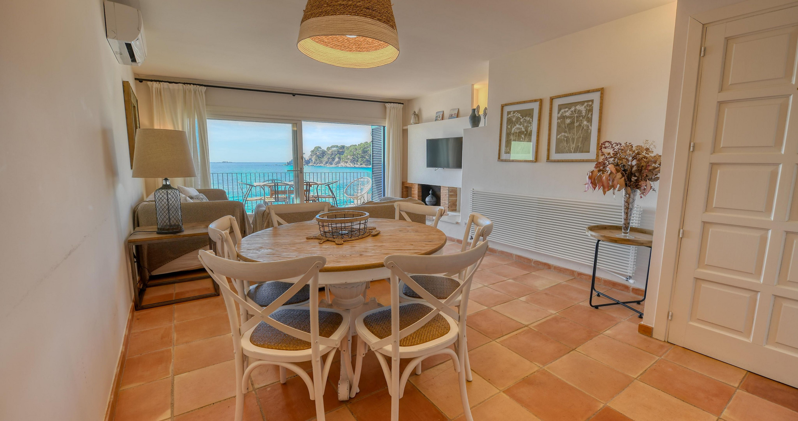 Appartement à Calella de Palafrugell qui possède Capacité pour 6 personnes. Logement de 150 m², situé en front de plage, avec vue sur la mer. La location se trouve à 5 m de la plage de sable "5m", 5 m de la plage de roche "5m", 12 m du domaine de Golf "12m", 20 m du supermarché "20m", 50 m de l'aéroport "50m".Elle dispose de cheminée, fer à repasser, accès internet (wifi), chauffage pompe à chaleur, climatisation, parking couvert bâtiment proche, 1 Télévision.La cuisine indépendante, Électrique, est équipée avec réfrigérateur, four, vaisselle/couverts, ustensiles/cuisine, cafetière et grille pain.