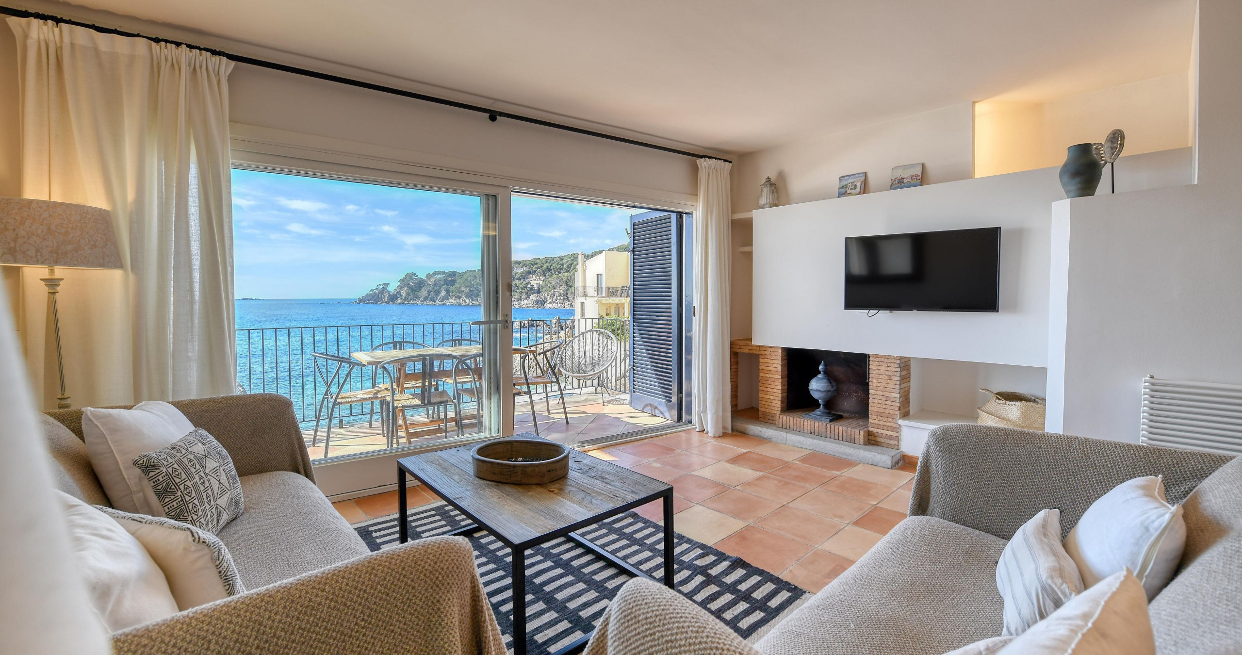 Appartement à Calella de Palafrugell qui possède Capacité pour 6 personnes. Logement de 150 m², situé en front de plage, avec vue sur la mer. La location se trouve à 5 m de la plage de sable "5m", 5 m de la plage de roche "5m", 12 m du domaine de Golf "12m", 20 m du supermarché "20m", 50 m de l'aéroport "50m". Elle dispose de cheminée, fer à repasser, accès internet (wifi), chauffage pompe à chaleur, climatisation, parking couvert bâtiment proche, 1 Télévision. La cuisine indépendante, Électrique, est équipée avec réfrigérateur, four, vaisselle/couverts, ustensiles/cuisine, cafetière et grille pain.