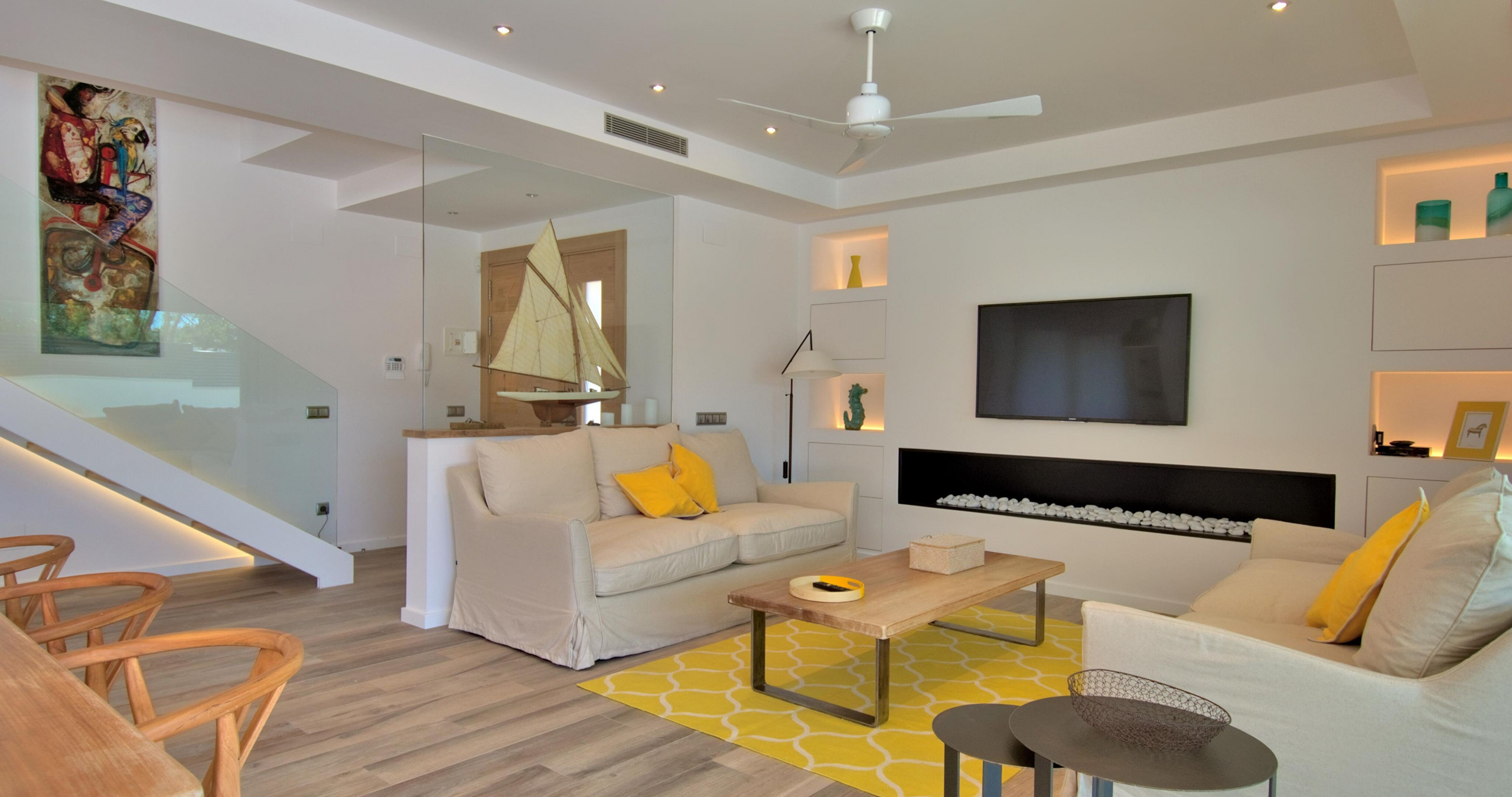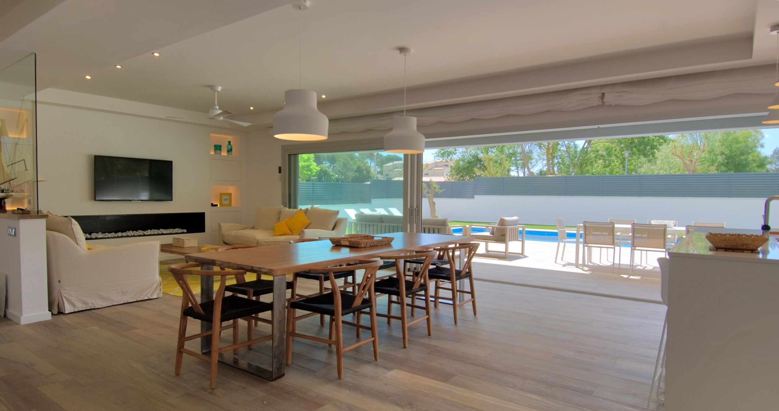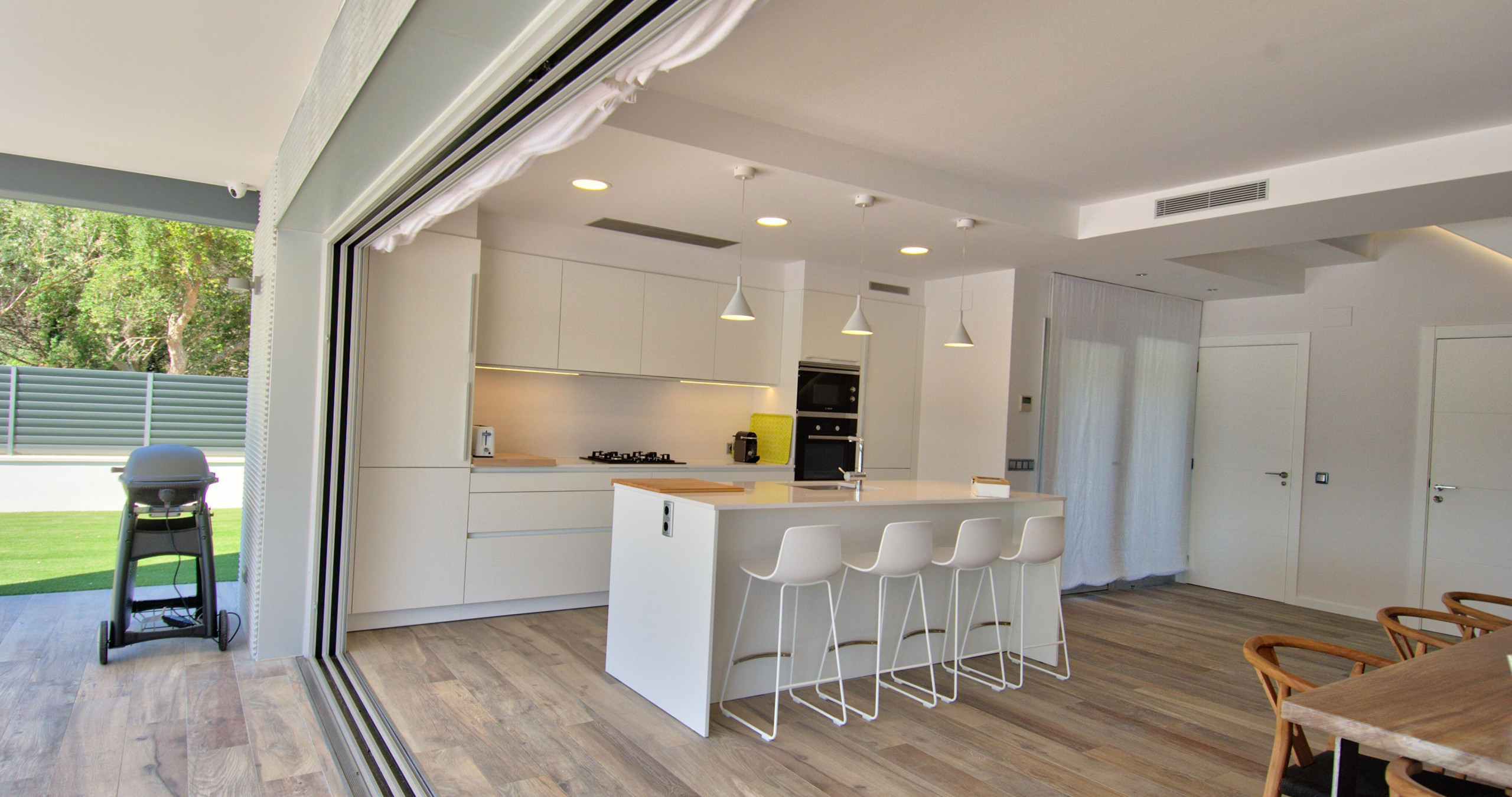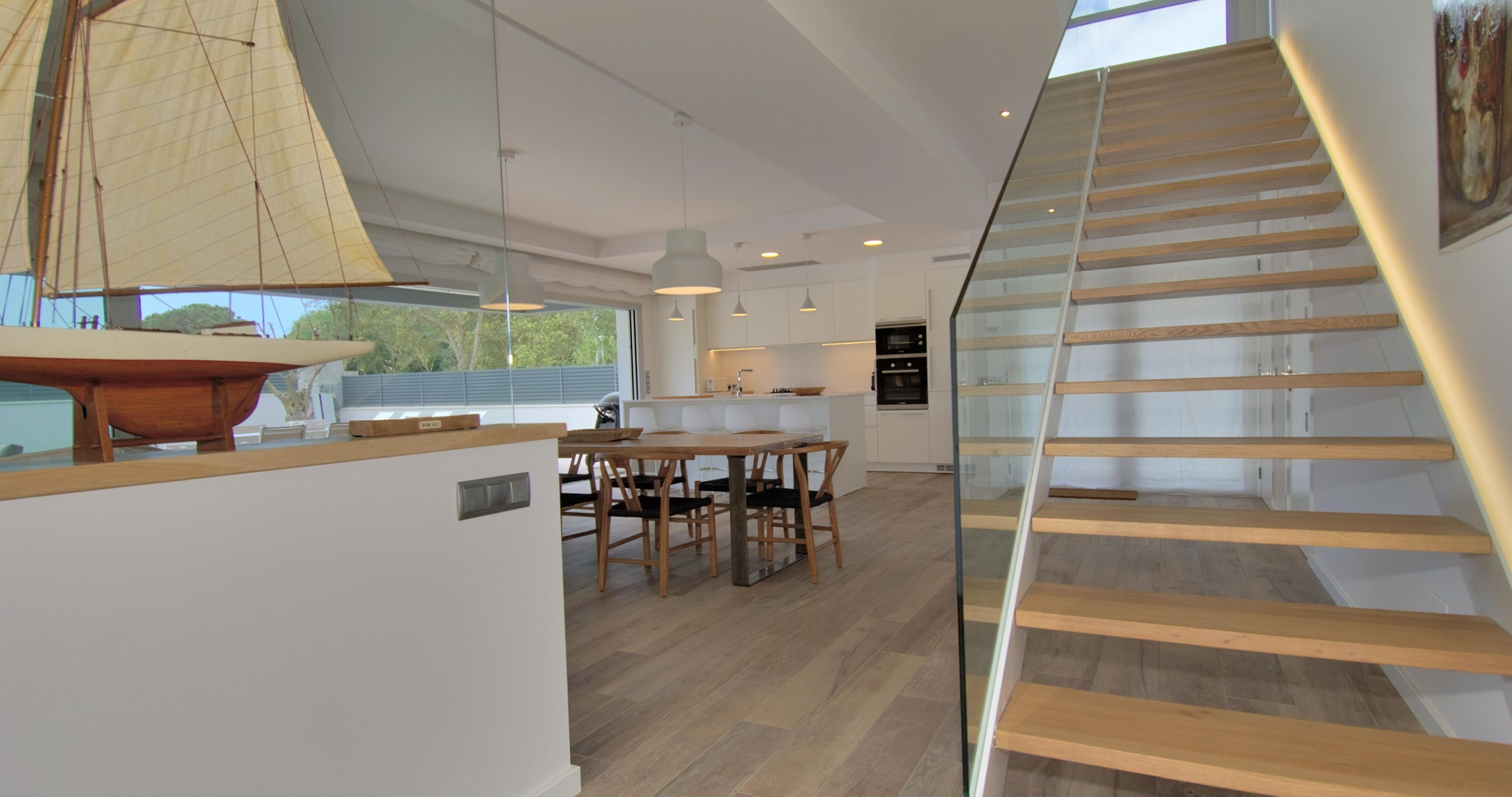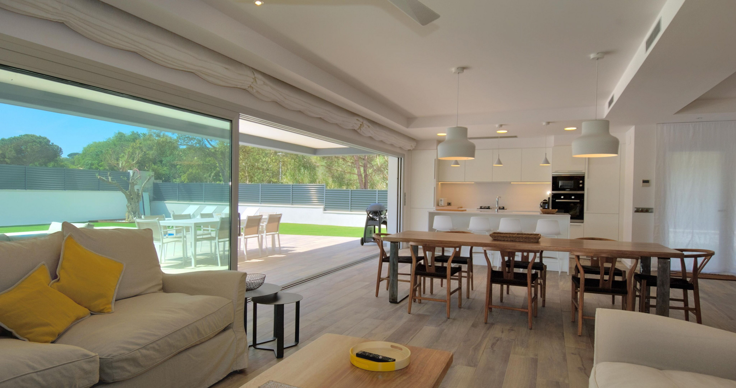 Intérieurs élégants et fonctionnels L'intérieur offre un équilibre parfait entre le design contemporain et la chaleur, avec une cuisine ouverte entièrement équipée et des espaces pensés pour le confort toute l'année, incluant une climatisation intégrale et une connexion WiFi haut débit.