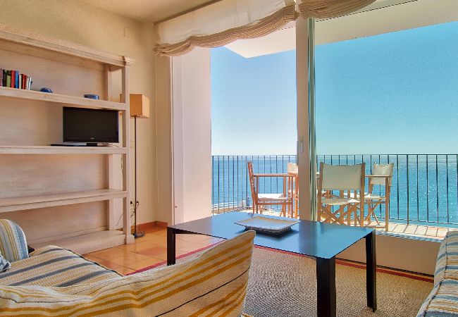 Apartament en Calella de Palafrugell posseeix capacitat per a 4 persones. Allotjament de 50 m², situat a primera línia de platja, amb vistes al mar. Es troba a 20 m de la platja de sorra "20m", 20 m de la platja de roca "20m", 150 m del supermercat "150m".Disposa de planxa, accés internet (wifi), calefacció bomba de calor, parking cobert en edifici proper, 1 Televisor.La cuina independent, eléctrica, està equipada amb nevera, vaixella/coberteria, estris/cuina i cafetera.